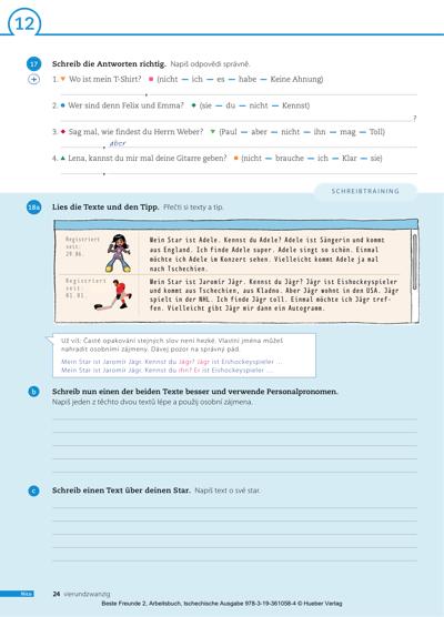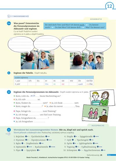 N AC H AU F G A B E 14 G R A M M AT I K 19a Was passt? Unterstreiche die Personalpronomen im Akkusativ und ergänze. Co se hodí? Podtrhni osobní zájmena ve 4. pádu a doplň bubliny. b Ergänze die Tabelle. Doplň tabulku. osobní zájmena 1. pád ich du er es sie wir ihr sie/Sie 4. pád ihn es sie euch sie/Sie 20 Ergänze die Personalpronomen im Akkusativ. Doplň osobní zájmena ve 4. pádu. Boris, rufst du mich heute Nachmittag an? Ja, ich rufe an. Boris, findest du nett? Ja, ich finde nett. Boris, magst du ? Ja, aber du nervst , Tina. Papa, bringst du zum Training? Ja, ich bringe um fünf zum Training. Papa, fotografierst du ? Ja, ich fotografiere . A U S S P R A C H E 21 Wortakzent bei zusammengesetzten Nomen: Hör zu, klopf mit und sprich nach. Slovní přízvuk u složených slov: Poslouchej, vyťukávej rytmus a opakuj. 1. Brötchen ss – Fischbrötchen ss s 6. Straße ss – Spiegelstraße ss s s 2. Nummer ss – Handynummer ss s s 7. Geld s – Taschengeld ss s 3. Bahn s – Straßenbahn ss s 8. Farbe ss – Lieblingsfarbe ss s s 4. Haltestelle ss s s – Bushaltestelle ss s ss 9. Training ss – Fußballtraining ss s s 5. Platz s – Sportplatz ss 10. Schmerzen ss – Bauchschmerzen ss s Ihr seid doch Tom und Nico! Ich kenne euch. Du kennst mich? Du bist Nico? Ich kenne dich. Was? Du kennst uns? 13 s s s s s s s s s s 1 3 A B 4 2 Nicofünfundzwanzig 12 Beste Freunde 2, Arbeitsbuch, tschechische Ausgabe 978-3-19-361058-4 © Hueber Verlag | |