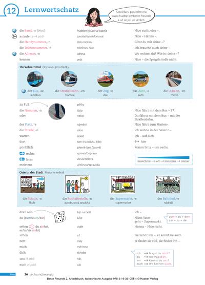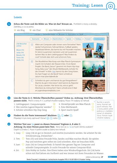 Startseite Nachrichten CommunityWissen Spiele Hobbys Freizeit LaLaLu – Informationen ++ Wissen ++ Kontakte ++ Spaß 236 Besucher online Moon (15) Jacky (14) Beauty (15) Tunix (16) Melly (14) A Allein am Computer oder immer vorm Fernseher? Nein danke! Schwimmen, Fahrrad fahren, Fußball spielen, Skateboard fahren, das kannst du mit Freunden machen. Ihr könnt zusammen trainieren und viel zusammen lachen! Was ist dein Lieblingssport? Was findest du cool? Schreib über dich und schick ein Foto. B Der Musiklehrer Max Koop vom Max-Planck-Gymnasium macht mit Schülern der Klassen 8 bis 10 ein BandProjekt. Die Band „Saturn“ gewinnt mit ihrem Hip-HopSong „Natur pur“ den Musik-Wettbewerb „Schüler für die Umwelt“ in Köln. Hier kannst du den Song hören. Du hast Fragen an die Band? Dann schreib an saturn-max-planck@web.de C Schreibst du gern und kannst du gut fotografieren? Machst du gern Interviews? Jetzt kannst du Reporter für LaLaLu werden. Hier lernst du, wie es geht! Möchtest du mitmachen? Dann schreib eine E-Mail an jugendreporter@lalalu.com Training: Lesen Lesen 1a Schau die Texte und die Bilder an. Was ist das? Kreuze an. Prohlédni si texty a obrázky. Zakřížkuj, o co se jedná. a ein Blog b ein Chat c eine Webseite für Schüler b Lies die Texte A– C. Welche Überschriften passen? Ordne zu. Achtung: Drei Überschriften passen nicht. Přečti si texty A– C a přiřaď vhodné nadpisy. Pozor: Tři nadpisy se nehodí. 1. Lieblingssport: Computerspiele – 2. Wer möchte Jugend-Reporter werden? 3. Schüler schreiben Hip-Hop-Song c Findest du die Texte interessant? Markiere , oder . Připadají ti tyto texty zajímavé? Označ , nebo . d Welcher Text aus 1a passt zu diesen Personen? Ergänze A, B oder C. Achtung: Zu einer Person passt kein Text. Který text ze cv. 1a se hodí k těmto osobám? Doplň A, B nebo C. Pozor: K jedné osobě se žádný text nehodí. 1. Lissy: Lissy (14) ist gut in Deutsch und möchte Journalistin werden. Sie arbeitet für die Schülerzeitung „Freizeichen“. 2. Tom: Tom (15) und seine Freunde Felix, Sandra und Max machen Musik. Sie spielen Pop und möchten gern selbst ein Lied schreiben. Aber sie brauchen Hilfe. 3. Juan: Juan (16) ist Computerfreak. Er bastelt den ganzen Tag am Computer und schreibt Computerspiele. Er sucht Freunde für seinen Computer-Klub. 4. Siri: Siris Hobby ist Surfen. Ihre Eltern haben eine Windsurfingschule. Siri (14) hatte schon mit fünf Jahren ein Surfbrett und war immer mit ihren Freunden im Wasser. Rychle si pročti texty. Poznáš tak jej ich témata. Pak si texty přečti ještě jednou a v každém označ tř i důležitá slova. Potom najdi vhodné nadpisy. 4. Umweltprojekt am Max-Planck 5. Foto-Wettbewerb 6. Sport macht Spaß! Nicosiebenundzwanzig Beste Freunde 2, Arbeitsbuch, tschechische Ausgabe 978-3-19-361058-4 © Hueber Verlag | |